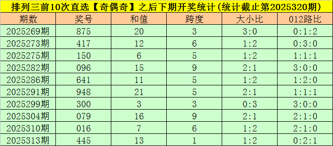 排列三上期奖号为725,开出奇偶类型为【奇偶奇】,前10次【奇偶奇】类型奖号分别开出:321、767、787、707、905、125、141、943、527、109;