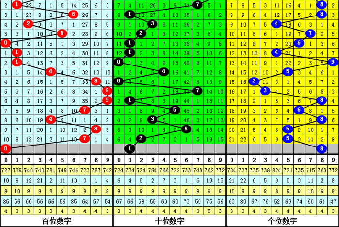 5.下期奖号跨度分别开出:3、6、5、9、5、5、3、9、6、1,其中跨度012路比为6:1:3,大小比7:3,奇偶比为8:2,本期适当关注2路跨度开出,参考跨度8。